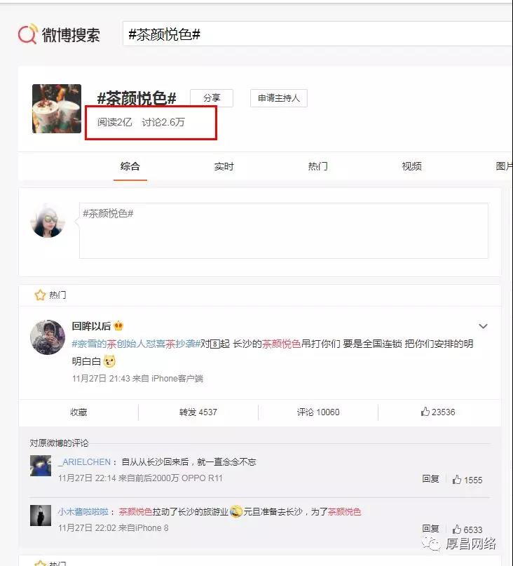 在兩個網(wǎng)紅茶鼻祖的你來我往中,長沙的#茶顏悅色#殺出了一條血路,截止筆者撰稿時,該話題閱讀2億、討論2.6萬,活躍度并不比昨天就開始的互懟大戲低,其或?qū)⒊蔀樵摯涡率讲栾嬈放频壍淖畲筅A家。