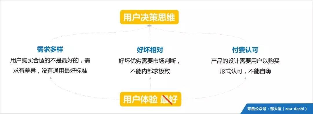 總結(jié)來說,用戶決策思維依然是以用戶為中心。不求單向體驗(yàn)最好,而是綜合需求多樣、好壞相對(duì)和付費(fèi)認(rèn)可三個(gè)維度。