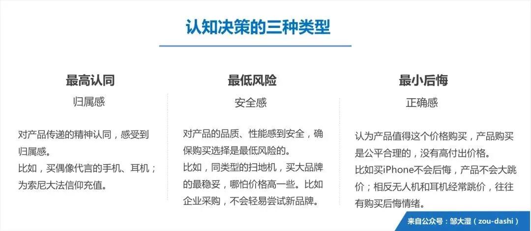 和價(jià)值決策相對(duì)的,是認(rèn)知決策。這個(gè)主要在手機(jī)、耳機(jī)、相機(jī)這些成熟品類中非常常見。一旦行業(yè)走向成熟化、品牌化,驅(qū)動(dòng)消費(fèi)者購(gòu)買的,就不僅僅是價(jià)值層面,還會(huì)有認(rèn)知層面的新元素。由此會(huì)有最高認(rèn)同、最低風(fēng)險(xiǎn)和最小后悔三種購(gòu)買決策規(guī)則。