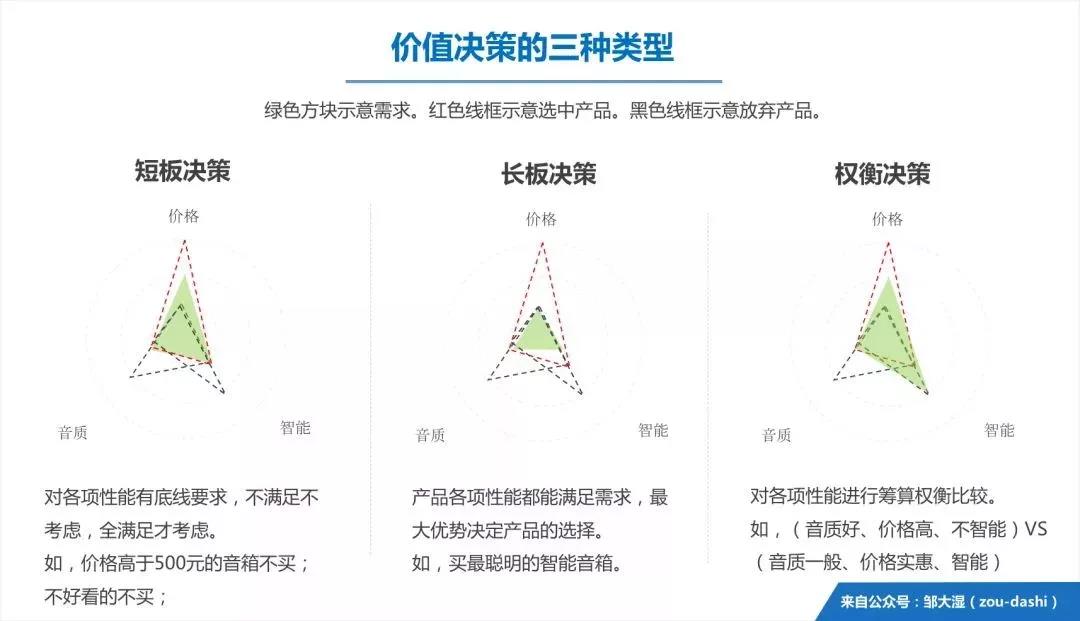 智能音箱的購(gòu)買選擇,基本來自產(chǎn)品的價(jià)值決策。主要有三條規(guī)則,分別是短板決策、長(zhǎng)板決策和權(quán)衡決策。