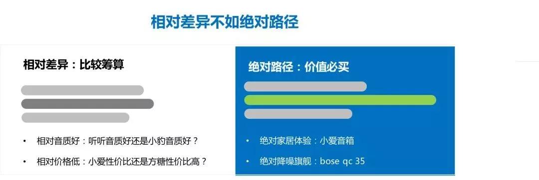 比如智能音箱,騰訊的聽聽的音質(zhì)不錯(cuò),是一個(gè)相比小愛和天貓的相對(duì)差異。但聽聽的音質(zhì)是絕對(duì)最好的嗎?不是。在聽聽發(fā)售之后,同樣發(fā)售的小豹音箱,也宣傳說音質(zhì)好。用戶很難判斷,兩者究竟哪個(gè)更好。再者,如果未來百度或者天貓聯(lián)合Bose推出一款價(jià)格999的品質(zhì)音箱。千元以內(nèi)的買音質(zhì)最好的決策邏輯,立刻會(huì)被Bose奪走。