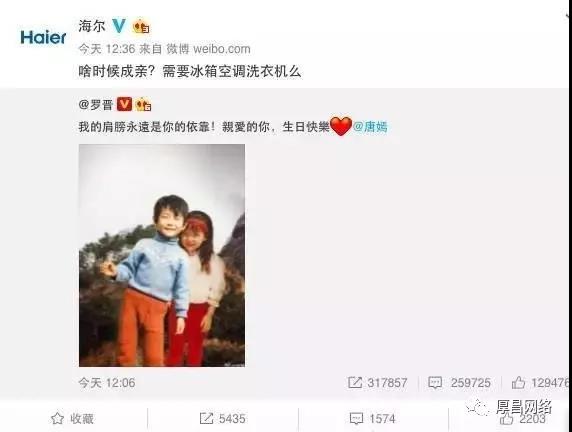 比如,2016在唐嫣羅晉公布戀情時(shí),海爾官微借勢(shì)發(fā)布微博“啥時(shí)候成親?需要冰箱空調(diào)洗衣機(jī)么”帶動(dòng)全網(wǎng)企業(yè)官微參與,事件曝光過億。