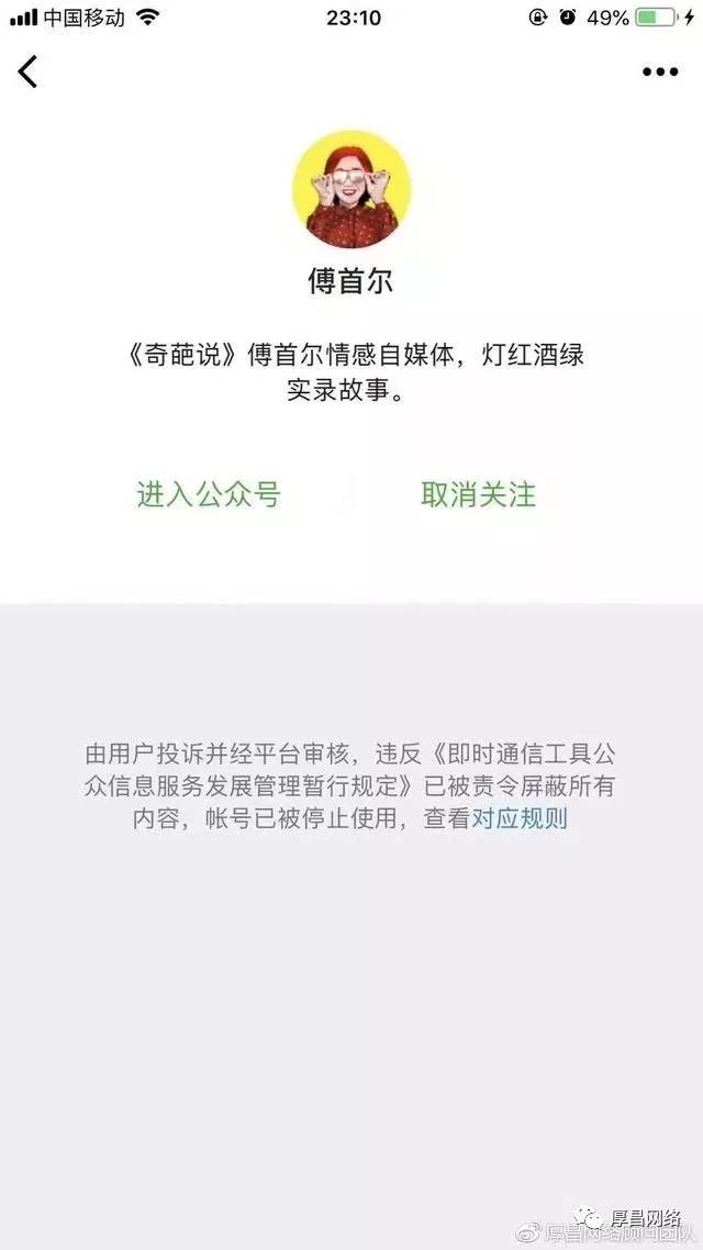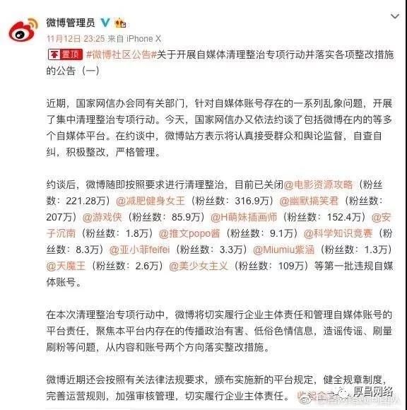 @電影資源攻略(粉絲數(shù):221. 28 萬)@減肥健身女王(粉絲數(shù):316. 9 萬)@幽默搞笑君(粉絲數(shù): 207 萬)@游戲俠(粉絲數(shù):85. 9 萬)@H萌妹插畫師(粉絲數(shù):152. 4 萬)@安子沉南(粉絲數(shù):1. 8 萬)@推文popo醬(粉絲數(shù):9. 1 萬)@科學知識競賽(粉絲數(shù):8. 3 萬)@亞小菲feifei(粉絲數(shù):3. 3 萬)@Miumiu紫涵(粉絲數(shù):1. 3 萬)@天魔王(粉絲數(shù):2. 6 萬)@美少女主義(粉絲數(shù): 109 萬)等第一批違規(guī)自媒體賬號。據(jù)目前統(tǒng)計已經(jīng)全網(wǎng)處理9800余個賬號。
