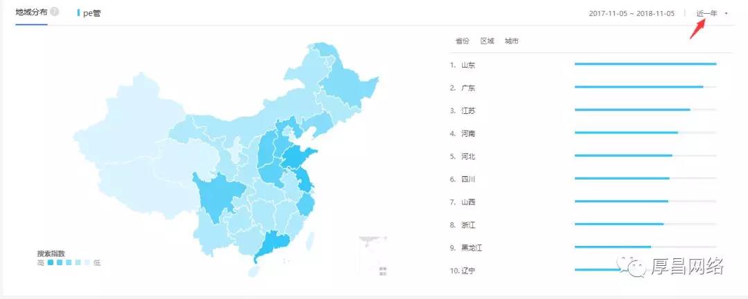 從上圖我們可以看出山東、廣東搜索量比較大,所以在推廣的時候山東、廣東可以作為重點地區(qū)來推廣。在這有一點需要注意的是:地區(qū)推廣時段應(yīng)看近一年甚至是更長的時間的,這樣參考價值才會更高。