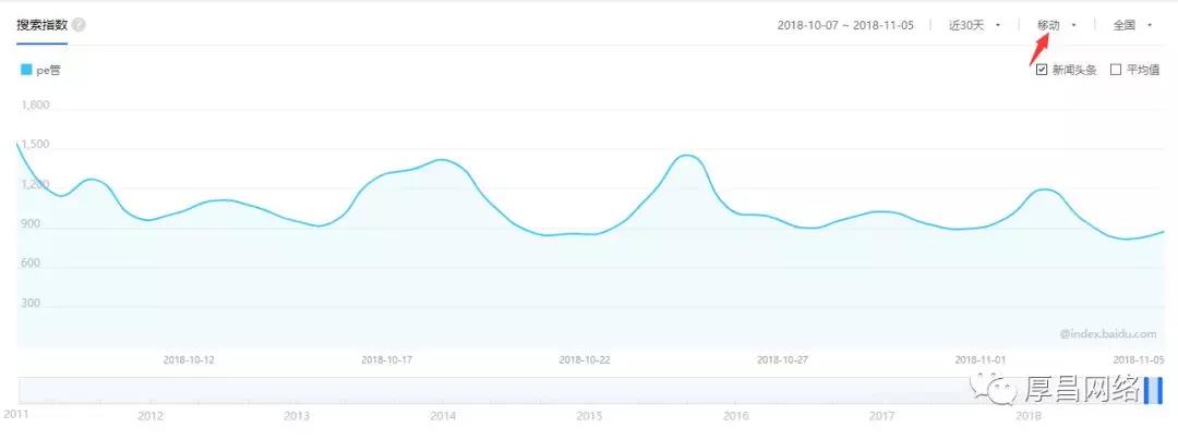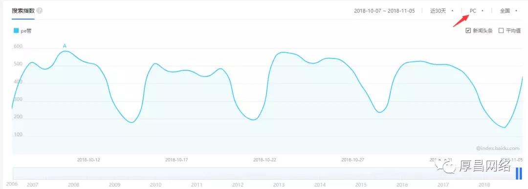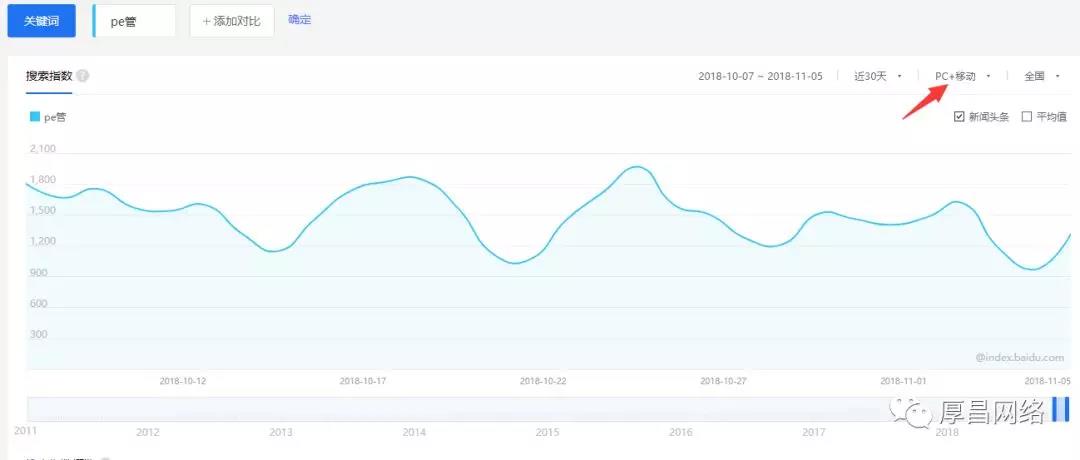 從上面三張圖我們可以看出來:傳統(tǒng)PE管行業(yè)整體指數(shù)在1500左右,PC端搜索與移動端分別為300左右和1500左右,這時我們就需要把更多預(yù)算放在移動端切記不要死磕PC端。