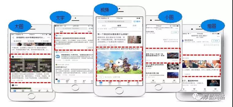 2、知乎的創(chuàng)意形式主要分為:大圖、文字、視頻、小圖、組圖,樣式如下
